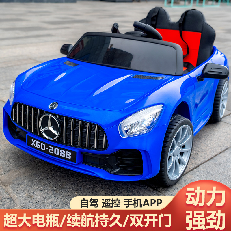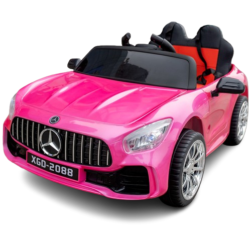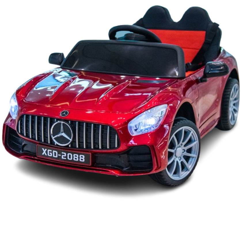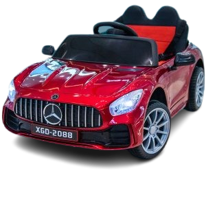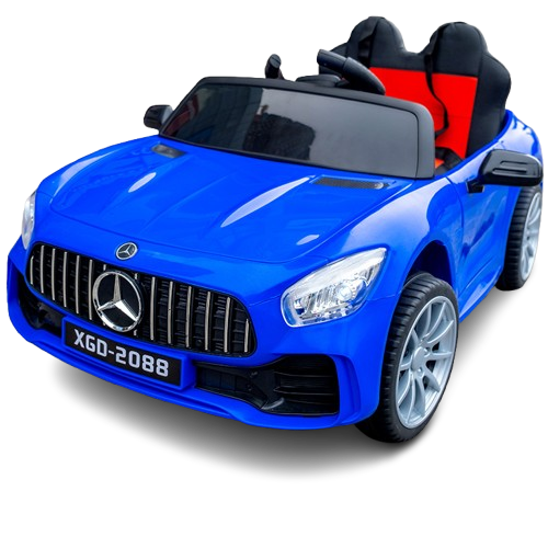 This electric ride-on car features a solid body design, detailed headlights, a stylish front grille, and smooth-rolling wheels that give it the look of a real sports car. The interior is designed with comfort in mind, featuring a spacious two-seat layout and safety belts to keep children secure while driving.