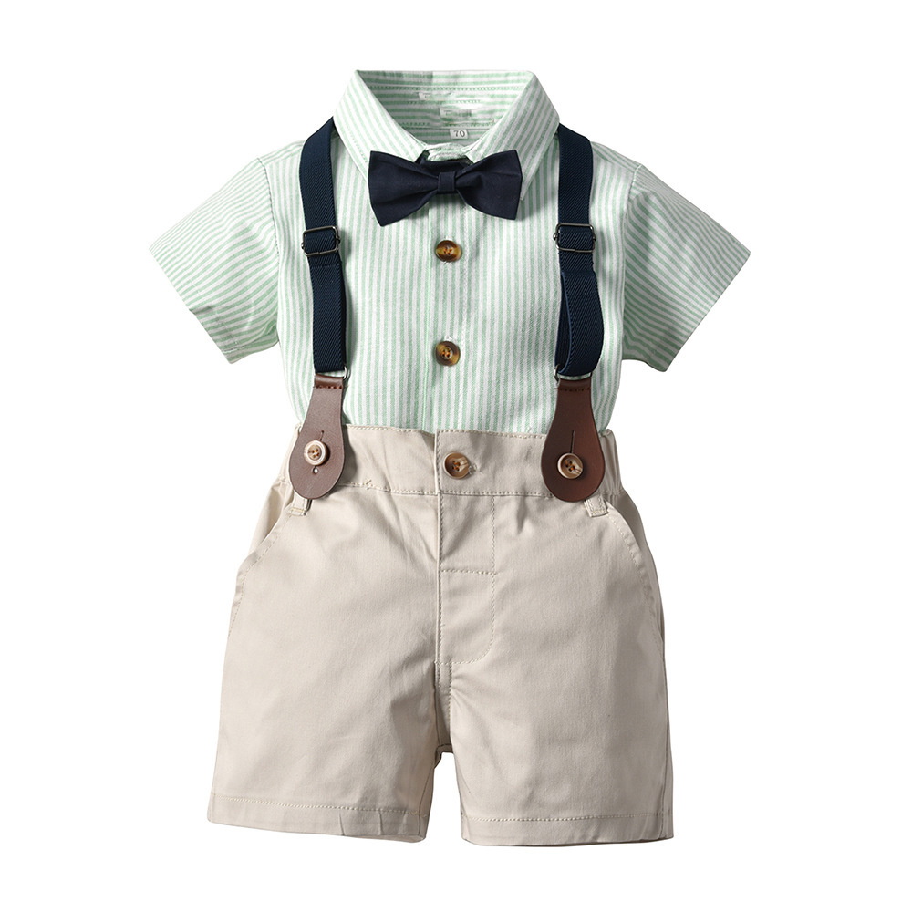 This baby outfit set features a neatly styled short-sleeve button-up shirt paired with comfortable fitted shorts, adjustable suspenders, and a matching bow tie to create a smart and charming look. It is made from soft, breathable fabric that keeps your baby comfortable throughout the day while allowing free movement for crawling, walking, and play. The lightweight and skin-friendly material makes it suitable for both warm and mild weather, while the easy-to-wear design allows for quick dressing and removal. This outfit is ideal for special occasions, family outings, celebrations, photoshoots, and everyday wear, giving your baby a polished appearance without sacrificing comfort.