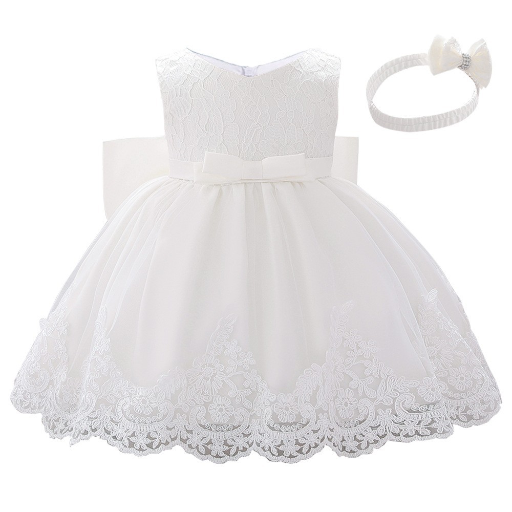 Beautiful lace baby dress with bow detail and soft layered skirt