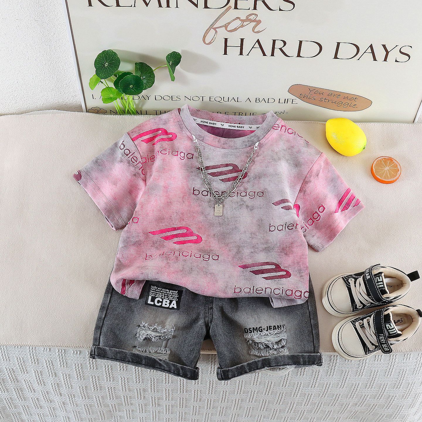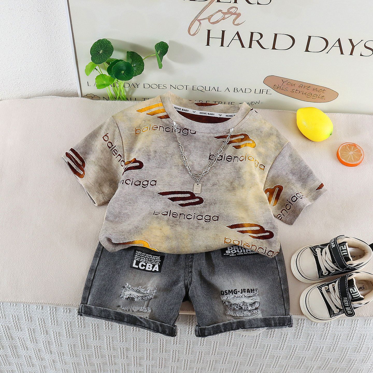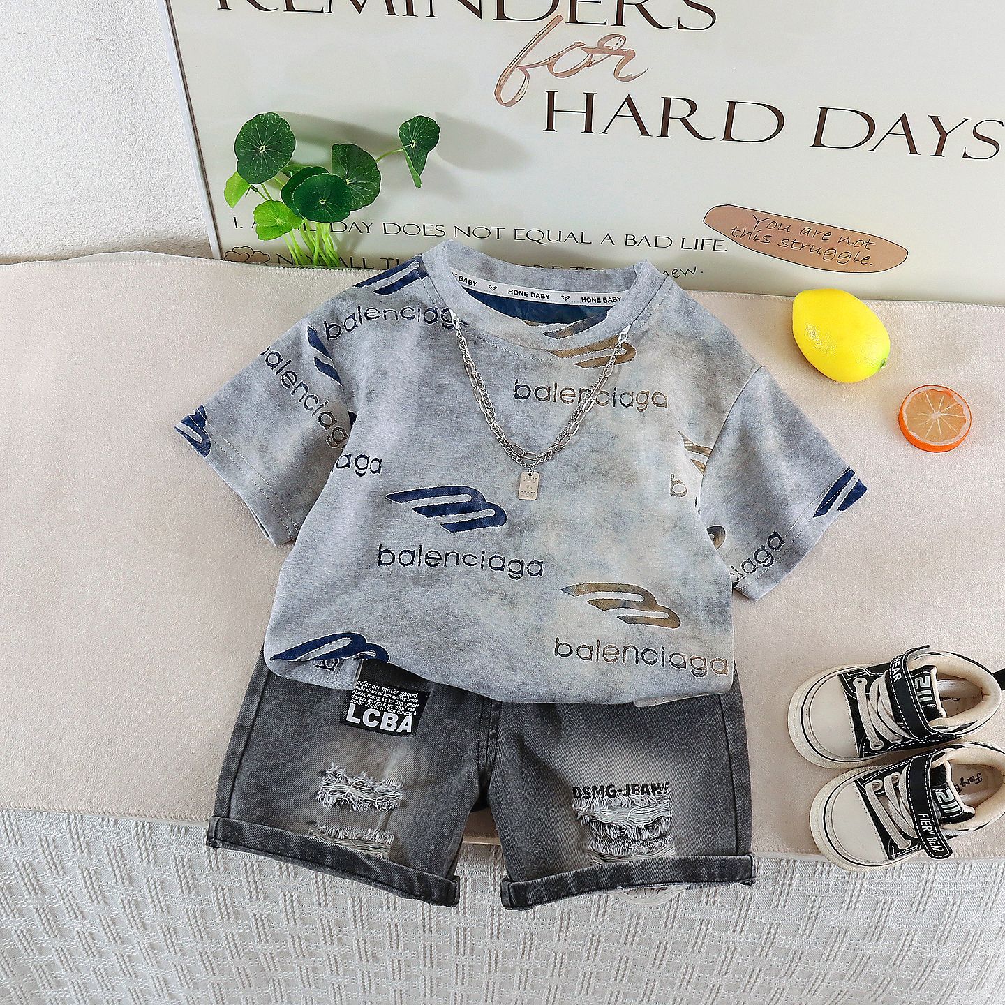 This trendy boys short set is designed for little ones who love a bold and confident look. The short sleeve tee features a modern letter print that adds personality and a cool street inspired vibe. Paired with stylish denim shorts, the outfit creates a complete and coordinated look that is perfect for everyday wear. Made from soft and breathable fabric, the set keeps your child comfortable while allowing easy movement for play and adventure. The relaxed fit ensures freedom to run, jump, and explore without feeling restricted. The shorts are designed with practical details and a flexible waistband to provide a secure and comfortable fit throughout the day. Ideal for outings, birthdays, casual photos, and family gatherings, this short set blends comfort and fashion effortlessly. At Peekaboo Place, we focus on outfits that make kids feel confident and comfortable, and this short set delivers style, durability, and playful charm in one easy to wear combination.